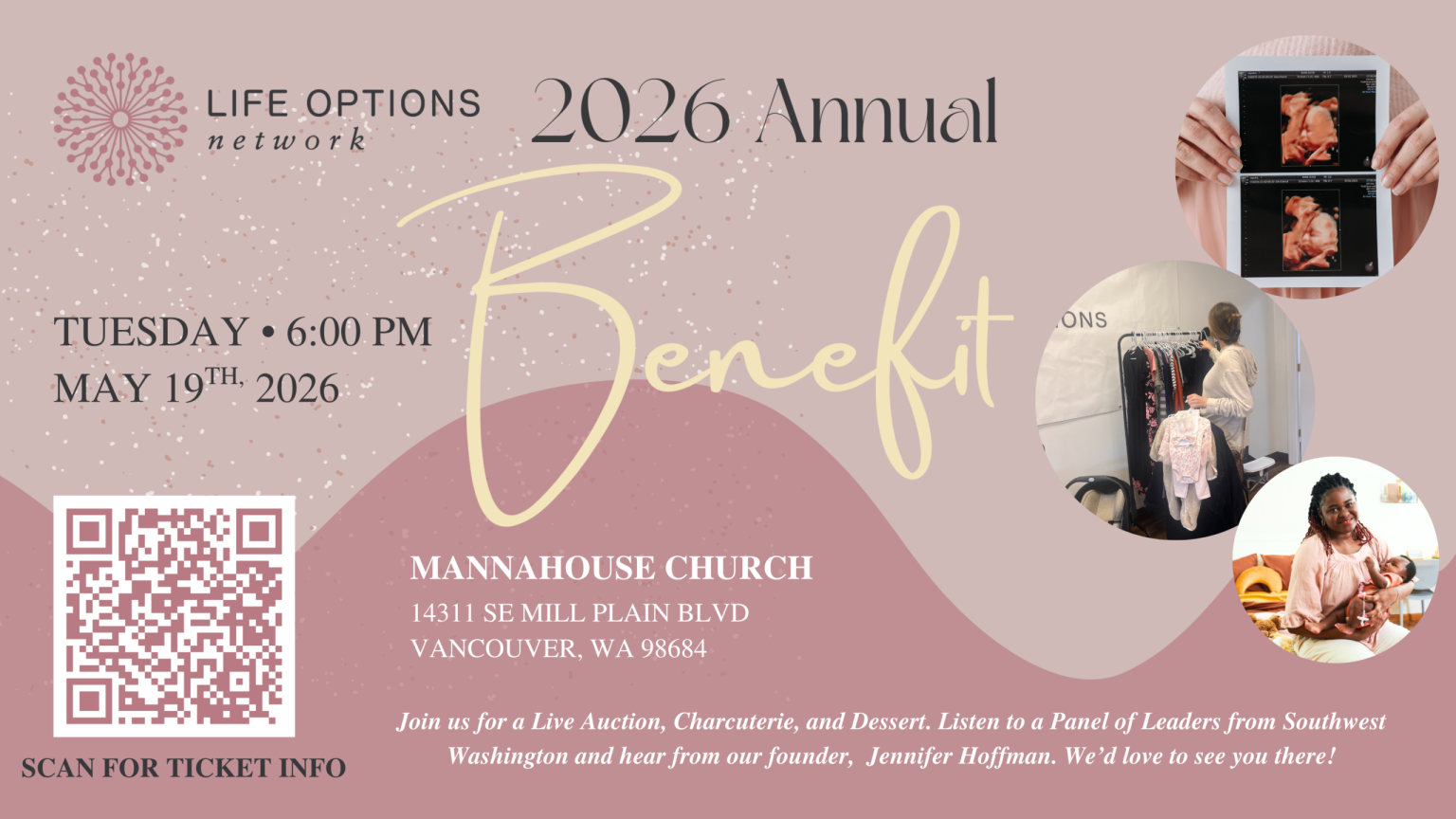 Join us May 19th at Mannahouse Church in Vancouver, Washington for a live auction to celebrate Life Options Network. Hear from our Founder, Jennifer Hoffman and a local panel sharing their insights and passion around this cause. You won't want to miss this!